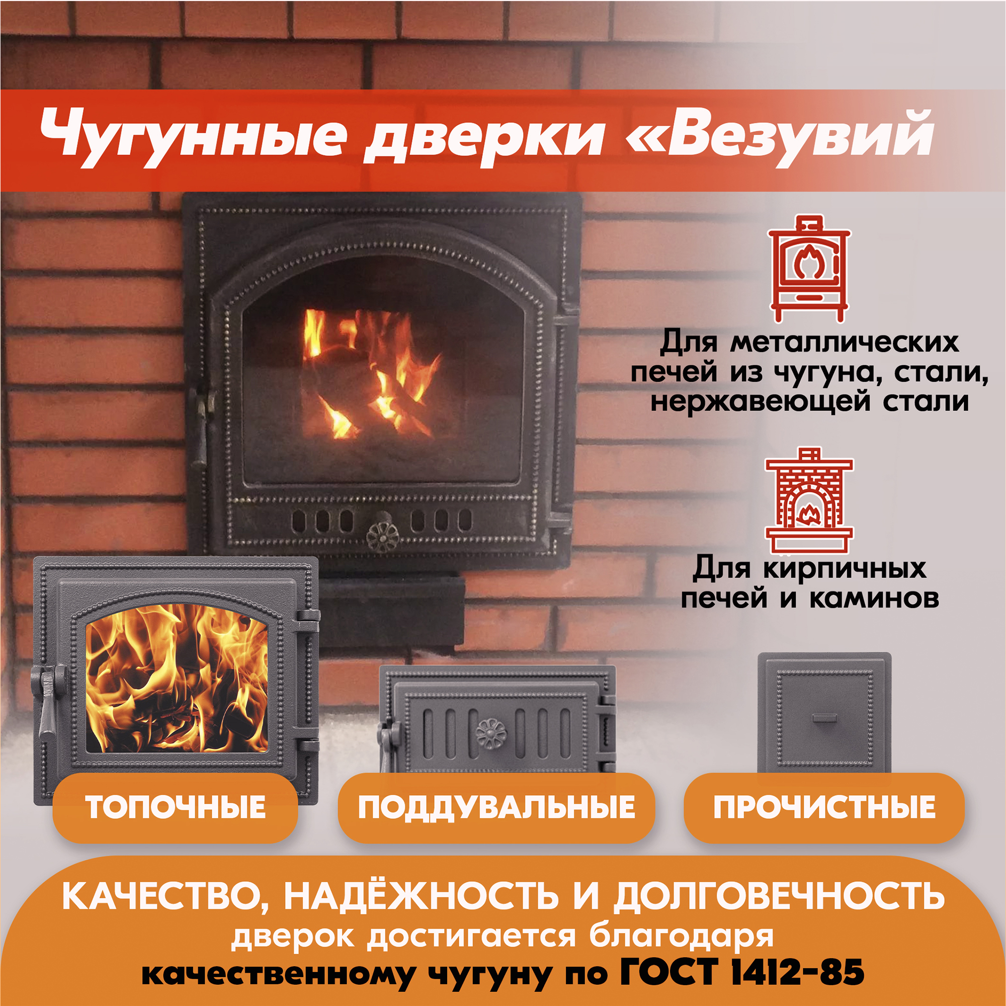 В нашем ассортименте имеется чугунное литье от российского производителя печей и каминов «Везувий»: дверки топочные чугунные со стеклом и без стекла, герметичные каминные дверки и негерметичные печные топочные дверцы, поддувальные и прочистные чугунные дверцы.